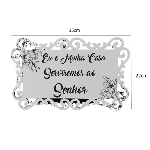 Material: MDF resistente Frase: "Eu e minha casa serviremos ao Senhor" Detalhes com arabescos e flores em preto e branco Ideal para sala, hall de entrada, igreja ou eventos cristãos Tamanho: 35x22cm Pronta para uso e fácil de apoiar em superfícies planas